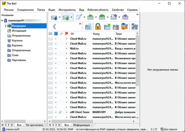 - Безопасность личной информации. Отличительная черта TheBat! – самая широкая поддержка протоколов аутентификации и шифрования при работе с почтовыми серверами. The Bat! – один из самых защищенных почтовых клиентов, «состоящий на вооружении» многих компаний, для которых защита приватной информации является вопросом жизни и смерти. Наиболее поздние версии The Bat! оснащены «умными» кнопками безопасности, которые помогают сделать пользовательскую информацию действительно личной. The Bat! надежно защищает вашу почту от сбоев в системе за счет возможности резервного копирования и синхронизации почты, а также от преднамеренного искажения данных и утечки конфиденциальной информации при передаче письма через Интернет. Безопасная аутентификация CRAM-MD5 не позволяет неавторизованным пользователям получить доступ к вашей учетной записи на почтовом сервере.