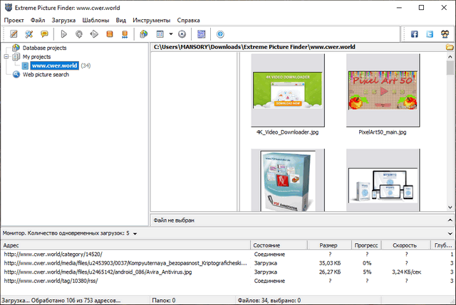 Extreme Picture Finder позволит Вам автоматически загрузить только нужные Вам файлы, избавив от просмотра назойливой рекламы, всплывающих окон и т.д. Просто укажите начальный адрес загрузки и тип файлов и предоставьте остальное Extreme Picture Finder! Также имеется встроенный модуль для просмотра загруженных картинок (в режиме уменьшенных изображений или слайд-шоу) и база адресов сайтов разделенных на категории для удобства поиска. В программу встроена функция "просмотра базы данных проектов" в меню "Инструменты". Можно добавить проект из выбранной категории и запустить его.