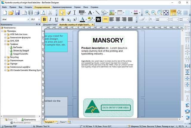 BarTender поддерживает RFID-метки. При этом, продукт BarTender настолько прост, что даже начинающий пользователь с его помощью может создать этикетку за несколько минут. Усовершенствованная интеграция, усовершенствованное управление печатью и расширенные функции защиты – это лишь то немногое, что вы получите с приобретением BarTender, пакета программного обеспечения для создания этикеток. Интерфейс программы переведен на множество языков, включая русский язык.