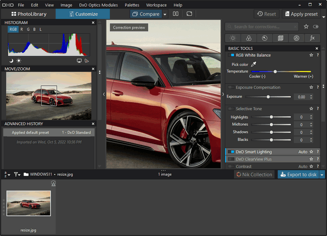 DxO PhotoLab 6 - мощный RAW конвертер и редактор изображений, который использует новые запатентованные технологии: эффективное удаление шумов на снимках, устранение недостатков освещения, восстановление цвета, а также применение сложных оптических исправлений и улучшение деталей. С помощью PhotoLab можно отрегулировать яркость, контрастность, цветовой баланс, устранить искажения и повысить четкость изображений, исправить цвета и экспозицию по краям и в углах фотографии, отрегулировать баланс белого цвета с учётом цветовой температуры и многое другое.