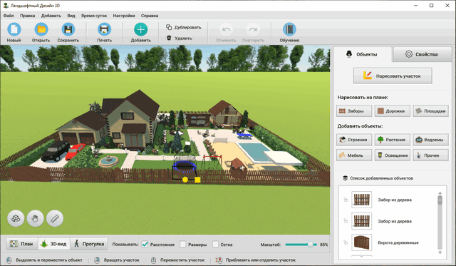 Ландшафтный Дизайн 3D — удобная программа на русском языке, в которой любой сможет создать участок своей мечты. В библиотеке редактора есть дома, изящные беседки, деревья, кустарники и цветы, теплицы, мебель и даже фонтаны! Вы сможете обустроить комфортную зону отдыха, наметить сад и огород.