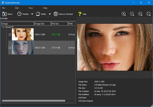 Teorex DupHunter - программа, для поиска похожих фотографий. DupHunter не просто ищет копии файлов, он анализирует ваши фотографии и ищет похожие (не одинаковые!), что позволяет вам выбрать самый лучший ракурс и качество, а ненужные удалить. Программа работает очень просто: вы указываете каталог, где лежит ваша коллекция фотографий, программа сканирует его и выводит похожие фотографии. Вы можете выбрать ненужные и удалить их.