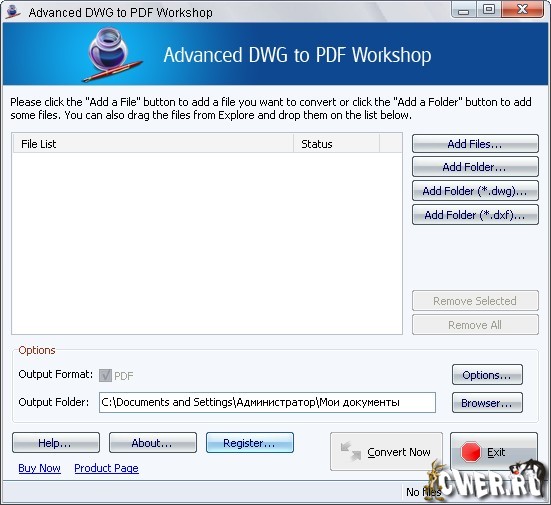 Advanced DWG to PDF Workshop - программа для конвертирования DWG и DXF файлов в векторные PDF файлы без необходимости установки AutoCAD и других дополнительных программ. Страница, вид и формат вашего чертежа полностью сохраняются, что позволяет с легкостью создавать высококачественный PDF документы. В качестве дополнительных функций имеется функция для объединения нескольких файлов в один PDF документ. Для конвертации CAD файлов вам нужно всего-лишь добавить нужные файлы в список программы и запустить процесс преобразования одним нажатием кнопки. Конвертация файлов может происходить в пакетном режиме, что делает ее процесс преобразования быстрым и удобным. Программа поддерживает все версии DWG и DXF формата, включая 2007 и 2008 версии. Обладает простым и легким в использовании пользовательским интерфейсом.