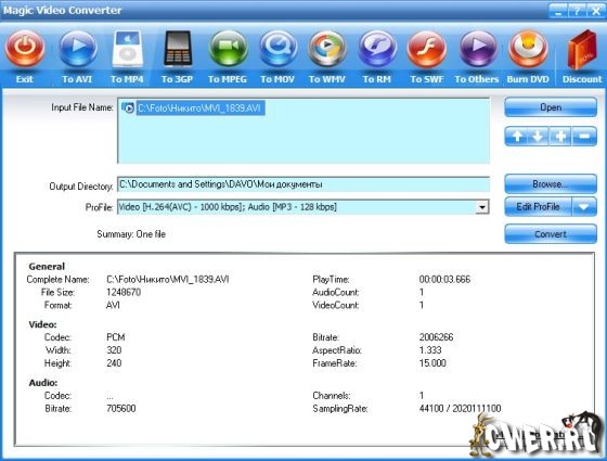 Magic Video Converter - многофункциональный конвертер со встроенным редактором и рекордером, который поможет вам преобразовать нужный файл в определенный формат: AVI, MPEG, MPEG 1, MPEG 2, MPEG 4, VCD, DVD, SVCD, RMVB, RM, WMV и другие видео форматы.