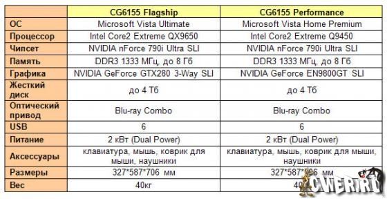 Компьютеры ARES строятся на базе процессоров Intel Core 2 Extreme. В флагманской модели графическая подсистема работает в режиме 3-way SLI. Кроме того, CG6155 может похвастаться приводом Blu-ray и поддержкой памяти DDR3. Система питания Dual Power (до 2000 Вт) и жидкостное охлаждение гарантируют стабильную работу игровой боевой машины. В нижеследующей таблице можно ознакомиться с техническими характеристиками новинок.