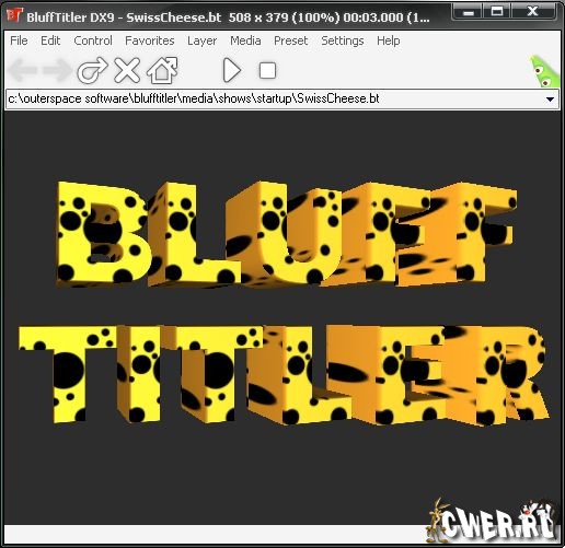 Программа для создания красивых текстовых эффектов и титров, применяемых при DVD-авторинге, а также трехмерной мультипликации. Результат можно просматривать в реальном времени с экспортом в картинку, видео формат. Мультипликации построены из слоев, которые могут отделяться независимо. BluffTitler поддерживает множество различных типов слоев: камера, свет, текст, картинка, видео, плазма, частица, аудио и т.д. Слои могут быть связаны друг с другом для создания специальных эффектов.