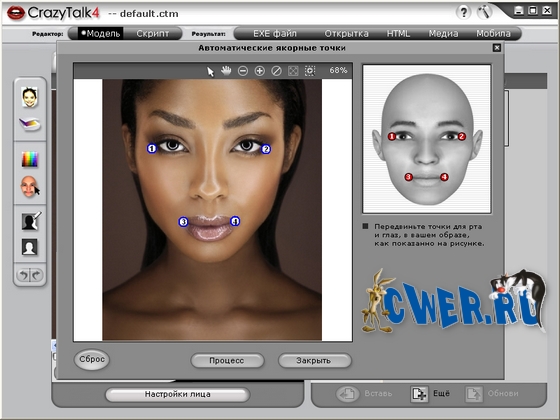 - Если хочется над кем-нибудь подшутить - программа поможет сделать это эффективно и быстро, для этого достаточно загрузить в CrazyTalk исходное изображение, указывать с помощью ключевых точек месторасположение глаз, рта и носа, очертить овал лица и можно приступать к свободному творчеству. Полет фантазии практически ничем не ограничен!