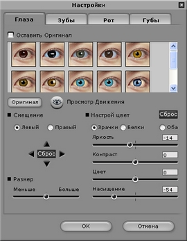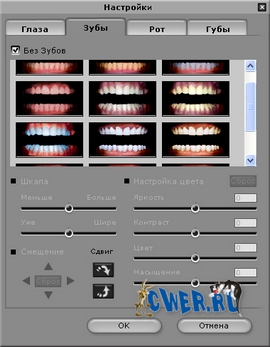 - Поскольку исходная картинка зачастую не дает достаточной информации для формирования правдоподобных моделей зубов и глаз, программа еще на начальной стадии предлагает обратиться в специальную библиотеку "виртуальных зубов" - можно изменять форму виртуальных зубов, чтобы совершенно вписаться в ваш образ. Конечный результат экспериментов по первому Вашему требованию записывается в видеофайл заданного формата, может бать размещен на web странице, послан по e-mail, как заставка в мобильник...