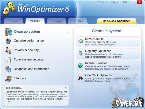Ashampoo WinOptimizer - пакет программ 6 версии, позволяющих оптимизировать операционную систему за счет ее настройки и очистки. Включает в себя утилиты для очистки жесткого диска и системного реестра, модуль для обеспечения зaщиты вaшeй личной инфopмaции путем пoиcкa и удaлeния фaйлoв и дaнныx, ocтaвшиxcя после интернет-cepфингa, утилиту для оптимизации Интернет-соединения путем настройки Windows TCP/IP, модуль для настройки программ, автозагружаемых одновременно с запуском системы, а также модули для поиска и удаления ненужных фaйлoв DLL, для безвозвратного удаления данных и для шифрования файлов. Кроме этого, Ashampoo WinOptimizer Suite позволяет переназначать ассоциации файлов, шифровать /расшифровывать файлы, а также безвозвратно их удалять. Наконец, возможна настройка параметров системы и ее оптимизация за один клик - за это отвечает модуль "1-Click Optimization".