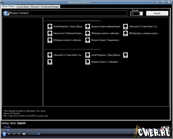 MusicTuner бесплатно осуществляет поиск MP3 в Интернете для последующей загрузки или воспроизведения. В программе есть стандартная библиотека и веб-браузер, создаются плей-листы. MusicTuner пригодится всем, кто не нуждается в обилии функций и щепетильно относится к системной производительности.