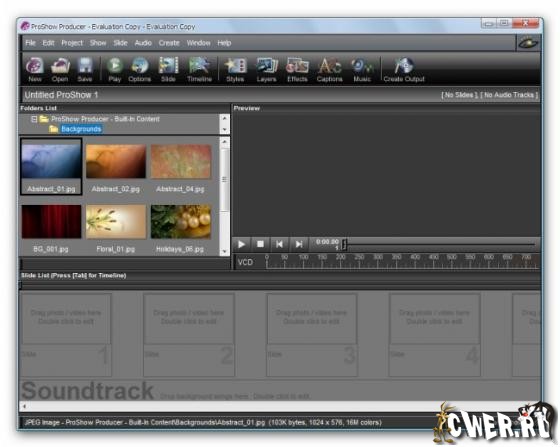Photodex ProShow Producer - является ведущим программным обеспечением в области профессионального создания демонстраций слайдов.Программа создает качественные слайд-шоу. Обладает рядом различных дополнительных возможностей. Может создать Видео CD диск (VCD, SVCD, XVCD, XSVCD, CVD и DVD) с помощью которого Вы сможете просмотреть на своем телевизоре любимые фотографии. Умеет записывать исходные изображения в виде MPEG-видеофайлов, поможет сделать хранитель экрана (ScreenSaver) для себя или друзей, а также выполняемую программу слайд-шоу, для просмотра которого не требуется установки на компьютер какого-либо дополнительного аппаратного или программного обеспечения.
