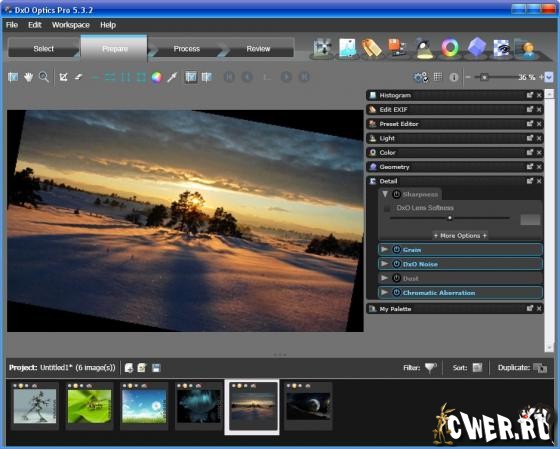 DxO Optics Pro - профессиональная программа для улучшения и корректировки вашей коллекции цифровых фотографий. Данное решение обладает многими прогрессивными технологиями, с помощью которых можно отрегулировать яркость, контрастность, цветовой баланс, устранить искажения и повысить четкость изображений, исправить цвета и экспозицию по краям и в углах фотографии, отрегулировать баланс белого цвета с учётом цветовой температуры и многое другое. Принцип работы DxO Optics основывается на проектах. Вы загружаете набор фотографий с жесткого диска, flash-карты или любого другого носителя, после чего систематизируете материал, описываете необходимые корректировки. После окончания работы над фотографиями запускается процесс экспорта документов. Кроме того, DxO Optics Pro может быть подключен в качестве плагина к графическому редактору Adobe Photoshop.