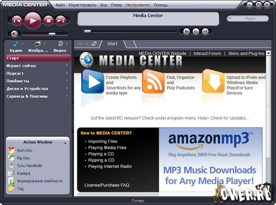 Программа дает возможность организовать коллекцию фотографий, просматривать детальную информацию о каждом файле. Уникальный полноэкранный режим позволяет работать с медиа-коллекцией, управляя ей с экрана монитора или телевизора. Поддерживаются различные пульты дистанционного управления. Media Center поддерживает множество моделей портативных плееров, позволяет синхронизировать медиа-библиотеку с iPod и многими другими устройствами.