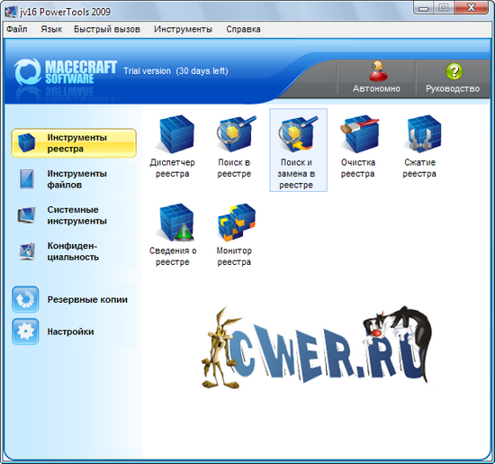 jv16 PowerTools - одна из лучших программ для работы с системным реестром и поддержания в оптимальном состоянии. Включает в себя инструменты для работы с реестром: мощный менеджер реестра - позволяет работать со списком программ из автозагрузки и деинсталляции, со списком зарегистрированных в системе типов файлов, расширений, контекстным меню IE (с тем, в которое часто вставляют свои пункты менеджеры закачек) и некоторыми другими. Этот менеджер часто помогает вручную удалить остатки после автоматической очистки реестра программы. Возможно использование в локальной сети.