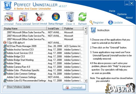 Perfect Uninstaller - программа для полного удаления нежелательных программ, которые нельзя удалить с помощью стандартного диалога удаления и установки программ Windows. С этой программой вы сможете удалять ненужные приложения в вашей системе быстрее и легче. Стандартный диалог установки и удаления программ часто не может удалить определенные приложения или сломанные ключи реестра, в отличие от данной утилиты, программа не только позволит вам удалить приложения, но и очистит ваш ПК от поврежденных записей в системном реестре, улучшая производительность и скорость вашей системы. Кроме того, с помощью этого приложения вы сможете узнать детальную информацию о том, какие файлы и записи реестра затронула установка той или иной программы. Интерфейс программы прост и легок в использовании.