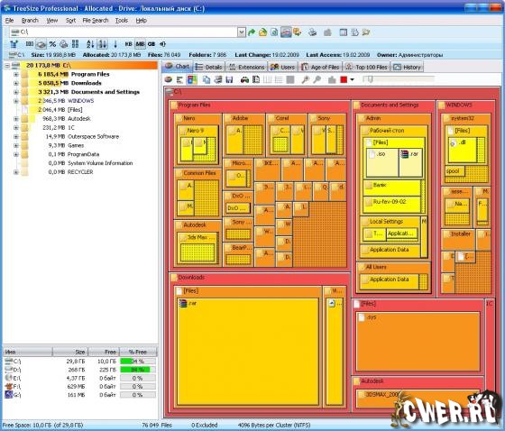 Утилита для лучшего понимания "куда уходит место на диске". TreeSize просканирует заданный диск (папку) и покажет все файлы и папки - кто сколько места занимает. TreeSize Pro позволяет просматривать результаты в виде диаграмм и графиков, есть гиперподробные детали, сортировка файлов по расширению, более продвинутые настройки и, наверно самый главный плюс - File Search. Удобная утилита для поиска и удаления самых больших файлов, старых файлов, ненужных (*.tmp, *.$$$) файлов и т.д.