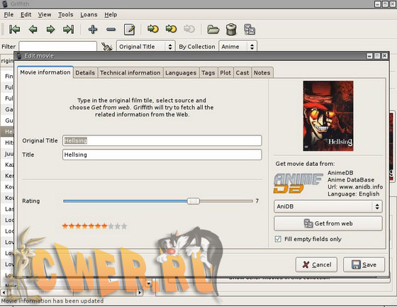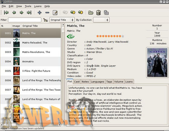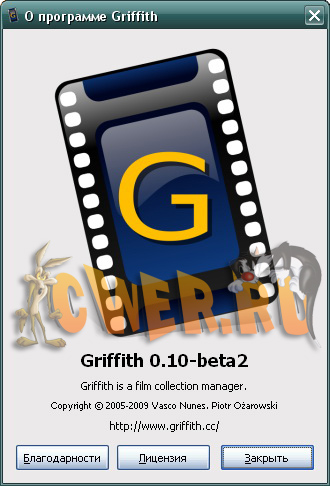 Griffith - видеобиблиотека, т.е. программа, куда вы добавляете название фильма, который есть у вас в коллекции, а программа сама ищет к нему описание и обложку. Программа выдаёт не только общие данные, но и характеристики указанных видеофайлов (кодек, разрешение, качество звука).