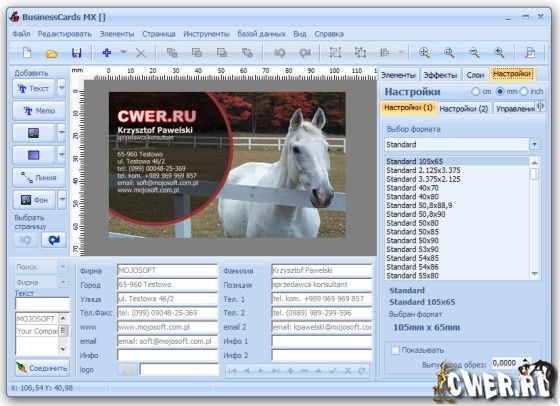 BusinessCards MX - программа для создания и проектирования визиток от польского разработчика. При помощи этой полезной программы вы легко и быстро спроектируете и распечатаете профессиональные визитки. Интерфейс программы спроектирован так, чтобы даже у начинающего пользователя не было проблем с использованием данной программы. Процесс проектирования заключается во вставке готовых доступных в программе элементов таких, как текст, фигуры, изображения и фон, а также произвольном их перемещении на разрабатываемом проекте. Программой используются шаблоны визиток, которые можно подготовить самому или использовать готовые образцы визиток, доступные в программе. Интерфейс имеет многоязычную поддержку, включая поддержку русского языка.