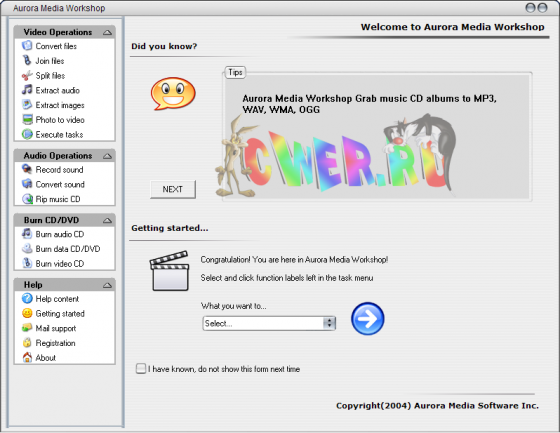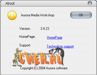 Aurora Media Workshop является программой, включающий в себя полный спектр средств для работы с видео и аудио файлами. Аудио и видеo конвертер, нарезка и соединение треков, граббер аудио CD, извлечение аудио из видео файлов, прожиг CD, создание видео CD из набора фотографий с множеством эффектов перехода, извлечение картинок (фреймов) из видео файлов, граббер DVD (VOB, DAT) в видео форматы, а аудио в MP3, WMA, WAV форматы, поддержка: AVI, MPEG1, MPEG2, ASF, WMV, VOB, DAT, DivX, XviD, MP3, WMA, WAV, OGG и других форматов.
