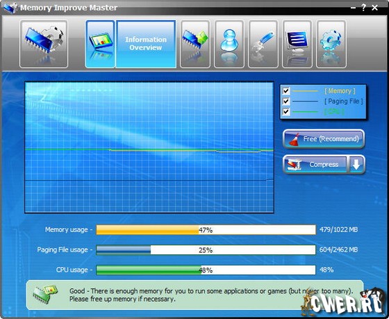 Memory Improve Master is an intellectualized and easy-to-use application designed to optimize and monitor system memory. It frees up and compresses system memory to make processes run faster and crash less often. Powerful features include the ability to view and monitor data of RAM memory, paging file usage and CPU usage in real time, set parameters RAM optimization, display running processes on you PC, etc.