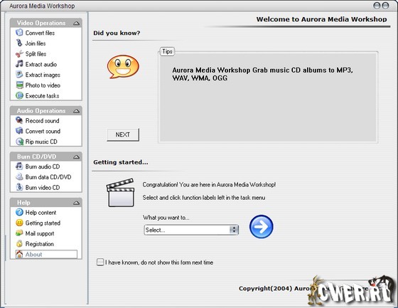 Неуклонно возрастающее число желающих использовать компьютер для работы с цифровым фото и видео говорит о том, что, возможно, уже в недалеком будущем вместо привычных фотоальбомов гостям будут предлагать посмотреть DVD с фотографиями и видео прошедших лет. Для того чтобы разобраться в тонкостях обработки фото и видео материала необходимо иметь достаточно много свободного времени и обладать железной выдержкой, которая бы позволяла сохранять спокойствие после очередной "недопустимой операции" в Adobe Premierre. Если ни первого, ни второго у вас нет, выход один - воспользоваться менее сложным программным обеспечением, с помощью которого вы сможете редактировать отснятый материал. Такая утилита должна содержать универсальный набор инструментов, для основных операций - резки и склейки видео, конвертирования в другой формат и т.д. Примером такого "мультимедийного мини-комбайна" может служить Aurora Media Workshop. Несмотря на то, что интерфейс программы достаточно прост, разработчики постарались сделать программу еще понятнее для пользователя и сделали мини мастер Getting Started. Тут предлагается выбрать из списка операцию, которую вы хотели бы произвести в программе. Кроме этого, доступно несколько десятков советов, раскрывающих возможности программы. Ознакомившись с ними, вы будете знать, как вам может пригодиться Aurora Media Workshop.