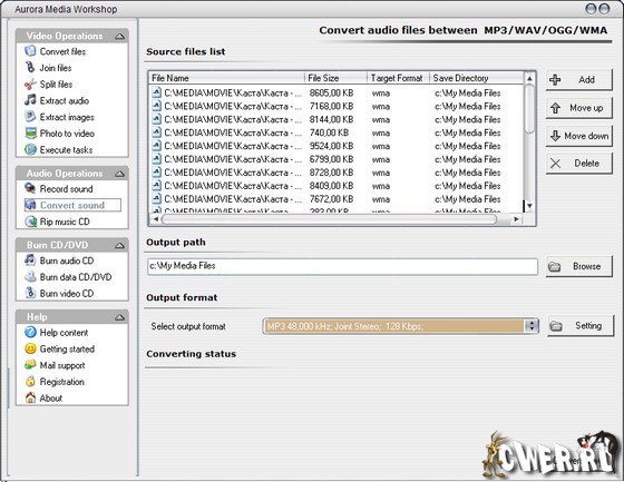 Aurora Media Workshop - набор инструментов для выполнения всех основных операций с видеофайлами - резки, склейки, конвертирования в другой формат, сохранения кадра в отдельный графический файл и т.п. Позволяет конвертировать медиафайлы (AVI, MPEG1, MPEG2, ASF, WMV, VOB, DAT , DivX, Xvid), производить риппинг аудиотреков, а также записывать с внешних источников. Кроме этого, с помощью этой программы можно записывать Audio CD, Data CD/DVD, Video CD и сохранять собранный образ отдельным ISO-файлом. Для поддержки WMA-формата требуется установленный Windows Media Encoder 9 или выше.