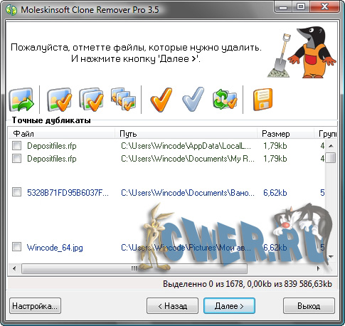 - Удобные средства для группового выделения найденных файлов: выделение всех файлов принадлежащих указанному каталогу, выделение всех файлов идентичных указанному.