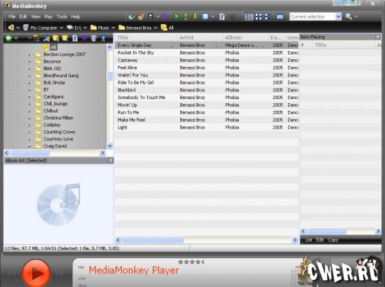 MediaMonkey - позволяет упорядочить музыкальную коллекцию, находящуюся на жестком диске, CD и в локальной сети - быстро отредактировать теги (вручную или автоматически с помощью данных из базы freedb.org), найти неполные или повторяющиеся файлы, переконвертировать файлы в другие форматы, записать музыку с CD (в форматах OGG, MP3 или WMA) или на CD, а также загрузить в mp3-плеер. Поддерживается работа с CD и файлами OGG, WMA, MPC, FLAC, APE, WAV и MP3. В MediaMonkey встроен проигрыватель с удобным интерфейсом и поддержкой модулей Winamp. Может интегрироваться с Nero для записи дисков.