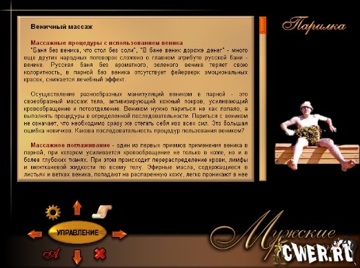 - Шесть основных разделов — о напитках, табаке, рыбалке, охоте, бодибилдингу и бане.