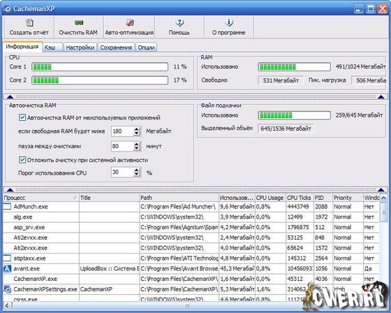 CachemanXP это программа, призванная увеличить скорость и стабильность работы компьютера, оптимизируя кэши, освобождая RAM и тонко настраивая множество параметров системы. Так называемая <<оптимизация за один клик>> делает программу CachemanXP подходящей для новичков и уверенных пользователей, но все же достаточно мощной и универсальной для профессионалов. Функция резервного копирования гарантирует, что все пользовательские модификации могут быть изменены одним движением.
