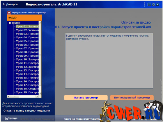 Видеокурс на русском языке и состоит из 21 видеоурока, показывающих разработку проекта здания двухэтажного кафе. Кроме того, на прилагаемом компакт-диске находится установочный файл ArchiCAD 11.