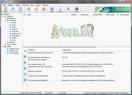 BitSpirit - мощный и удобный в использовании клиент BitTorrent, который не только работает по этому протоколу, но также имеет ряд дополнительных возможностей.Среди них следует отметить: удобный и понятный интерфейс, возможность работы сразу с несколькими закачками, механизм кеширования данных на диск, быстрое восстановление работы, поддержка выбора файлов, удобный файловый менеджер, поддержка опции обмены сообщениями, компрессия по алгоритму GZip, работа по расписанию, интеграция в IE, поддержка HTTP/SOCKS4/5 Proxy, малая требовательность к ресурсам ПК.
