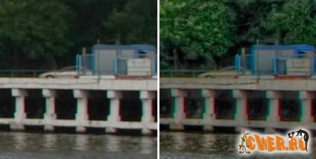 Второе – абберации. Увеличим один и тот же фрагмент исходного и полученного изображения на краю кадра.