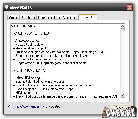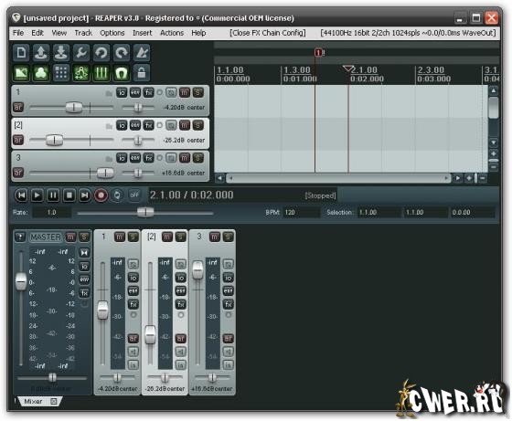 Reaper - компактный аудиоредактор для создания, редактирования и записи многоканальных аудиотреков с возможностью обработки каждого трека по отдельности. REAPER позволяет применять во время обработки аудио множество эффектов, поддерживает технологии ASIO, Kernel Streaming, WaveOut и DirectSound воспроизведение и запись. Поддерживает работу с файлами в форматах WAV, OGG, MP3, MIDI (чтение) и WAV, MIDI (запись), управление уровнем громкости, изменение границ трека, допускает многоуровневый откат/повтор выполненных операций и многое другое.