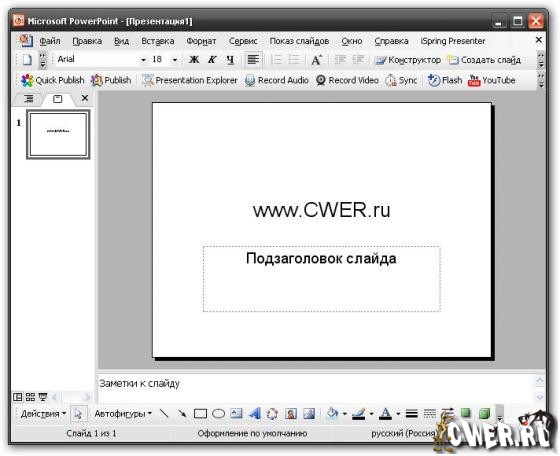 iSpring Presenter - программа для преобразования презентаций PowerPoint в формат Flash. Продукт ориентирован на пользователей Microsoft PowerPoint и позволяет создавать презентации, учебные курсы, баннеры, открытки в формате Flash. Преобразование занимает несколько секунд, а качество полученных Flash-презентаций остается неизменным.