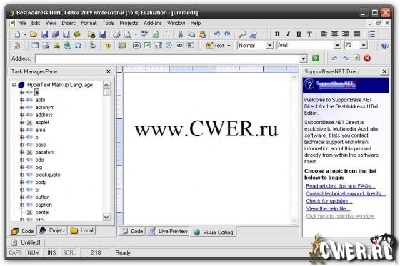 BestAddress HTML Editor – полнофункциональный HTML-редактор от компании Multimedia Australia, позволяющий без особого труда создать собственный сайт в сети Интернет. Программа умеет создавать меню на основе DHTML-кода, проверять синтаксис, подчеркивать ошибки, обладает поддержкой интеллектуального ввода кода, обладает богатым набором встроенных шаблонов и может быть использована для обновления ранее созданного ресурса. Пользователям программы доступна помощь в режиме онлайн, которая содержит всесторонние рекомендации по работе с утилитой, информацию консультационного характера и исчерпывающую справочную информацию о HTML-коде версии 4.01 и CSS2.