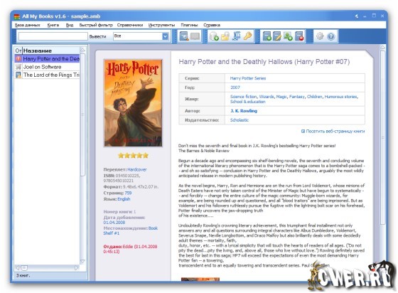 Создайте из своей коллекции книг электронную библиотеку. Следите за книгами, данными в долг, и находите любую книгу всего за пару секунд. Добавляйте книги в коллекцию, даже не печатая их описание. All My Books найдет всю информацию о книге в Интернете. Группируйте книги в коллекции по названиям, авторам, публикаторам или ищите по любому из полей. Вы сможете создавать свои собственные поля, в которые будете заносить информацию о книгах: комментарии, заметки, и т.д.