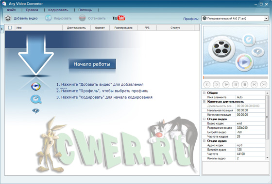 Any Video Converter - программа для конвертирования видео файлов, позволяет перекодировать популярные видео форматы (AVI, MOV, RM, MPEG, DVD, WMV, MP4 и FLV) в DVD, VCD, MP4 или FLV. В утилите присутствует возможность использовать для кодирования файлов как готовые профили с установленными параметрами видео, которые ориентированы на определенные устройства (бытовой DVD-проигрыватель, мобильный телефон), так и самостоятельно подбирать свои настройки конвертирования. Перед началом кодирования видео, его можно просмотреть во встроенном проигрывателе. В программе есть функция конвертирования только выбранного участка видео файла, для чего во встроенном плеере достаточно указать начало и конец нужного отрезка.