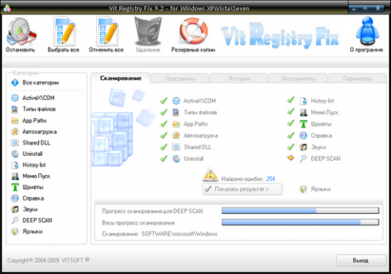 Vit Registry Fix - программа для очистки реестра от ненужных записей (ошибок). Так как после удаления програм в реестре оставляются различные ненужные записи, то со временем этих записей становится все больше и больше и это является причиной долгих задержек перед загрузкой програм, снижение общей производительности системы и других ошибок. Vit Registry Fix находит эти ошибки и разделяет их на категории (ActiveX\COM,Типы файлов, AppPath, автозагрузка, Shared DLL, Uninstall, History list, меню ПУСК, Шрифты, Справка, Звуки, Ключи Software (Deep scan) и дополнительно ищет битые ярлыки на дисках. Также есть возможность ручного удаления ключей из разделов Software (как для HKCU так и для HKLM), создания резервных копий перед удалением ошибок а также можно создать список исключения.