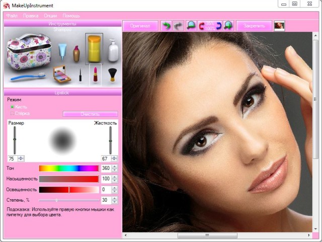 MakeUp Instrument — набор инструментов от разработчика PhotoInstrument, который заточен под женскую аудиторию и предназначен для ретуширования фотопортретов. При помощи программы вы сможете выполнять косметическое усовершенствование портретов, наносить профессиональный макияж и устранять видимые дефекты кожи, такие как морщинки, пигментные пятна или шрамы.