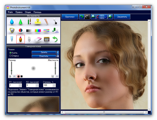 PhotoInstrument - легкий редактор для обработки портретов цифровых фотографий. От Очистителя кожи до придания ему гламурного вида "глянцевых журналов", попутно включая инструменты для: ретуширования, удаления красных глаз, сглаживания морщин, увеличения чёткости, коррекции цвета и многого чего еще, для приданию портрету совершенного вида и желаемой привлекательности.