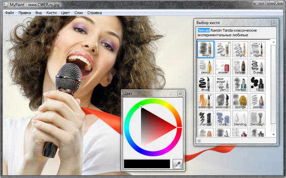 MyPaint - специализированная программа для рисования, заточенная под использование графических планшетов. Обладает очень мощным движком кистей, благодаря чему все инструменты, а они в программе только рисующие, реализованы как специализированные кисти. В программе бесконечный холст, есть отмена действий и простая реализация слоёв.