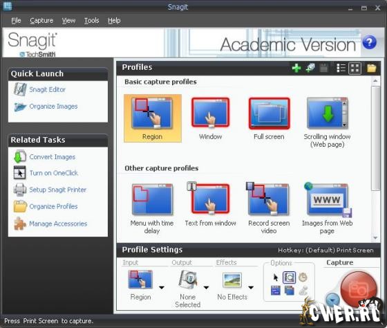 Основное назначение программы - снятие скриншотов с экрана монитора, причем SnagIt умеет делать не только статичные графические "снимки" выбранной области, но и, например, записать в видео то, что происходит на экране, а также захватить картинку из приложений, использующих Direct X, DirectDraw и Direct 3D.