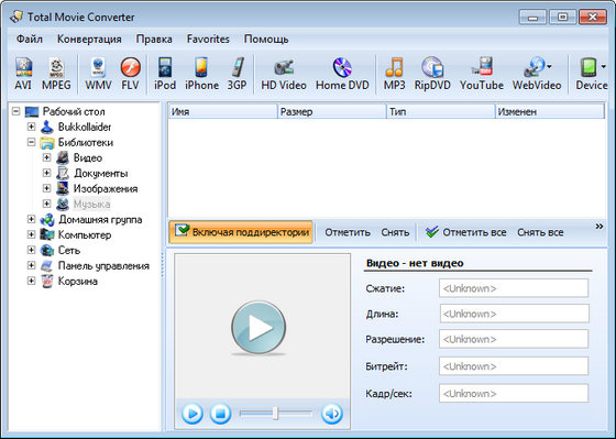 Total Movie Converter – удобное решение для преобразования видео-файлов почти всех распространённых кодеков в такие форматы, как AVI, MPG, WMV, MPEG, FLV. Кроме того, Total Movie Converter отлично конвертирует видео для iPod, iPhone, Zune, Apple TV, Archos, Creative Zen Vision, XBox и других устройств. Теперь вы можете поставить сразу несколько видео файлов на конвертацию перед тем, как пойдёте спать (или соберётесь на вечеринку), а утром всё будет готово для загрузки в Ваш iPod.