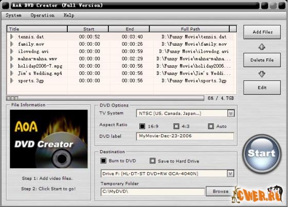 Ultra DVD Creator - мощный и удобный инструмент для создания DVD, VCD или SVCD видео дисков из, практически, всех видео-форматов AVI, DivX, XVid, MPEG, WMV, ASF, MOV, RM, MP4 и FLV. Благодаря возможностям данной утилиты вы сможете просматривать свою коллекцию видео файлов на обычном DVD-плеере у себя дома. С помощью этого программного обеспечения вы сможете конвертировать любые видео файлы в DVD, VCD или SVCD совместимый Mpeg-файл и записать его на CD или DVD диск. Используйте данную программу для создания VCD / DVD из ваших записей с видеомагнитофона, веб-камеры или скачанных файлов из интернета. Вы сможете создавать DVD-диски без каких либо специальных знаний в этой области.