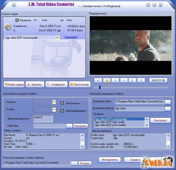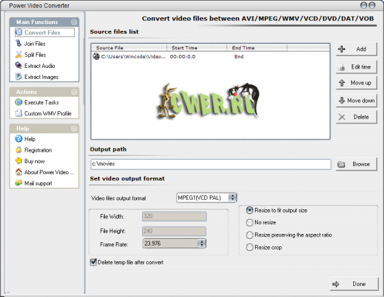 Утилита Power Video Converter предназначена для преобразования видеофайлов из одного формата в другой. Кроме этого, Power Video Converter позволяет производить резку и склейку файлов. Программа поддерживает форматы AVI, MPEG1, MPEG2, VCD, DVD, ASF и WMV.