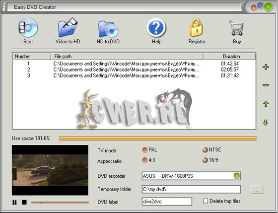 Extra Video Creator - программа для конвертации и соединения видео. Программа соединяет несколько видео файлов в один и конвертирует из AVI, MPEG, MOV, RM и WMV в AVI, DIVX, XVID, MPEG, MOV, RM, RMVB и WMV. Создание меню, прожиг готового результата на диски, поддержка большинства пишущих DVD–5, DVD–9; DVD-R, DVD+R, DVD-RW, DVD+RW, DVD+R DL, DVD-R DL, DVD-RAM приводов и дисков, автоматическое выключение компьютера после завершения работы, поддержка записанных видео DVD на бытовых и автомобильных проигрывателях, создание и прожиг ISO файлобразов.
