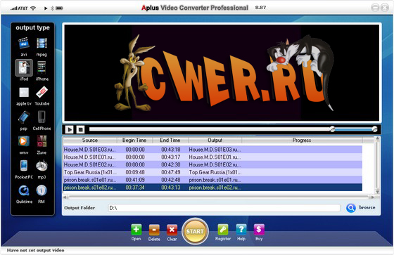 Aplus Video Converter - программа, позволяющая конвертировать между собой видео файлы практических всех форматов. Например flash video, FLV, youtube video, AVI, Divx, ASF, WMV, WMA, MPEG, MOV, QT, RM, RMVB в rm, mov, wmv, avi, mpeg, iPod видео файлы, iPhone видео файлы, apple tv видео файлы, sony psp видео файлы, видео файлы для мобильных телефонов, pocket pc видео файлы, zune видео файлы, flv и другие...
