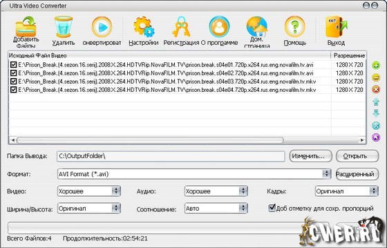 Ultra Video Converter - является мощным и удобным инструментом для конвертирования, соединения и нарезки видео файлов, фрагментов. Особенности: поддержка AVI, DivX , XviD, MPEG, DAT, WMV, ASF, RM, RMVB, MOV, QT , MP4, M4V, 3GP, FLV, MKV и других видео форматов, выбор и настройка параметров конвертирования, нарезка и соединение отрезков с сохранением в выбранный формат и параметрами, подключение кодеков, поддержка файлов с размером больше 2GB, высокая скорость и высокое качество, простой и удобный интерфейс.