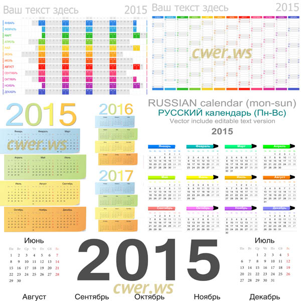Если вы любите что-то необычное и креативное и яркое, тогда этот замечательный векторный клипарт именно для вас. Предлагаю скачать высококачественные дизайнерские решения на тему календарей на 2015 год. В архиве собраны удивительные и необычные дизайнерские работы, которые вы можете использовать для своих целей. В этих календарях, новая неделя начинается с понедельника, а не с воскресенья. Креативных фантазий и классных идей желает вам сайт cwer.ws.